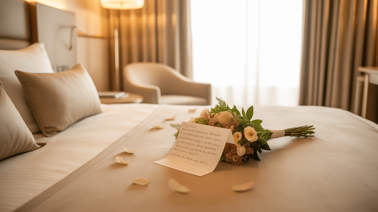 La beauté de la composition ne suffit pas, sa mise en valeur est cruciale. Une disposition stratégique dans la chambre — sur la table basse face à la vue, ou à côté d’un mot d’accueil — magnifie le geste. Une association soignée avec des bougies, une lumière tamisée ou une décoration spécifique décuple la magie du moment. Pour cela, une parfaite coordination avec l’hôtel et un respect strict du timing (installation juste avant l’arrivée ou pendant le dîner) sont les secrets d’une scénographie sans faille.