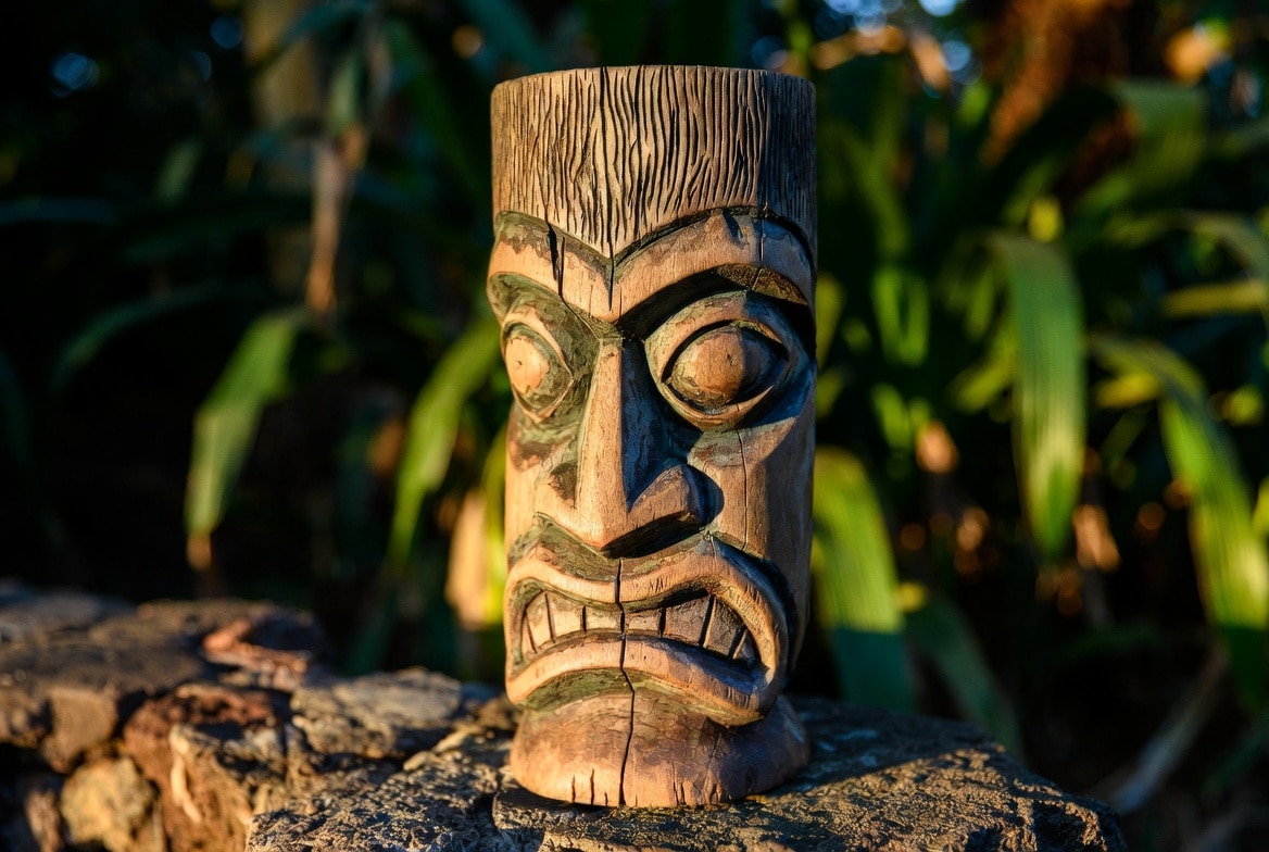 Tiki vient du mot Ti’i en maori et tahitien. Dans la mythologie polynésienne, le Ti’i est le premier homme, mi-humain mi-dieu, à l’origine de l’espèce humaine. Les sculptures qui le représentent, taillées dans le bois ou la pierre, marquent les lieux sacrés et honorent les ancêtres.